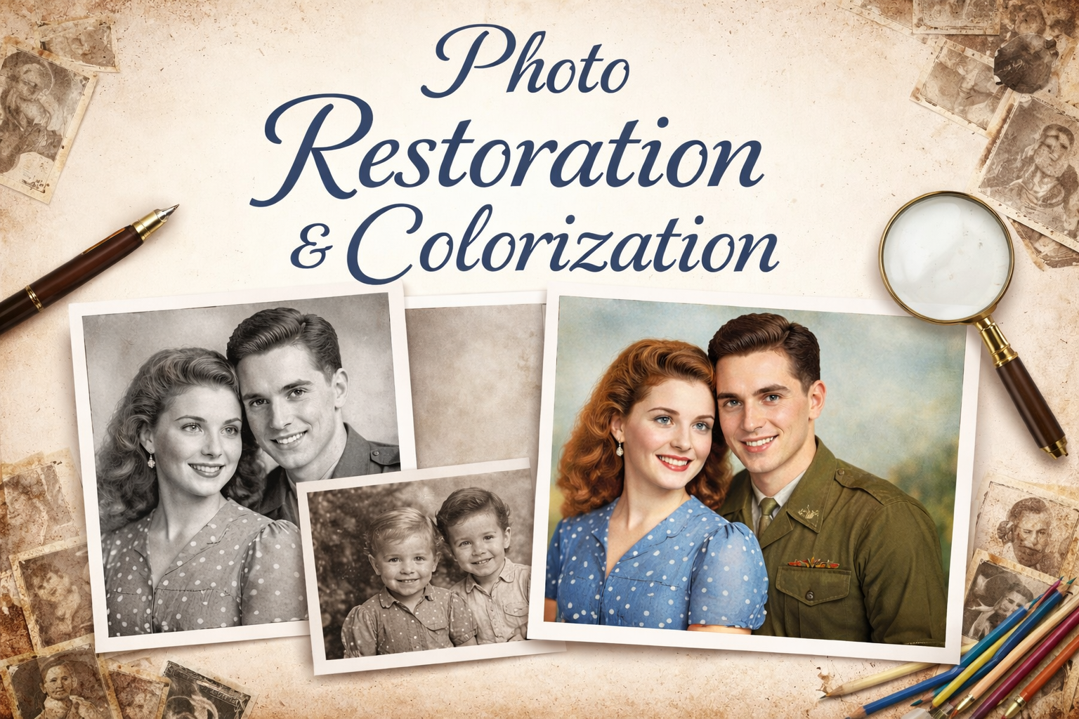 Let us restore and colorize your old Photos. From fade to rips or water stains, we can restore and or colorize to make better than new.